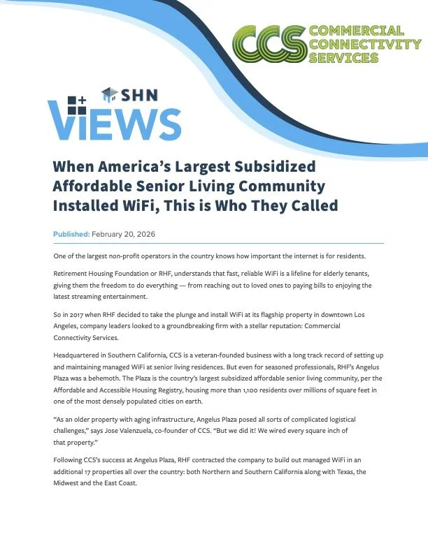 CCS began its relationship with RHF almost a decade ago, when we began providing internet at Angelus Plaza in Downtown Los Angeles. That massive project was, and remains, a great success. It led to CCS providing managed wifi at an additional nine RHF properties in Texas, and two more in Northern California. This new expansion brings the total number of RHF properties served by CCS managed wifi to 17. In total, we will now be providing broadband internet to more than 2,400 units across the country.